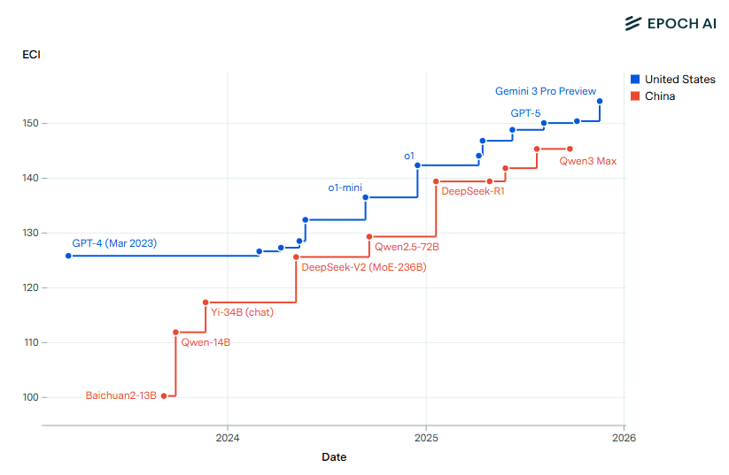Chinesische KI-Modelle hinken US-Modellen im Schnitt sieben Monate hinterher, wie eine aktuelle Analyse von Epoch AI zeigt. Seit 2023 stammen demnach alle Modelle an der Leistungsspitze, gemessen am Epoch Capabilities Index, aus den USA. Der Abstand schwankte zwischen vier und 14 Monaten. Die Forscher sehen einen Zusammenhang mit der Unterscheidung zwischen proprietären und Open-Weight-Modellen: Fast alle führenden chinesischen Modelle sind quelloffen, während US-Frontier-Modelle geschlossen bleiben.