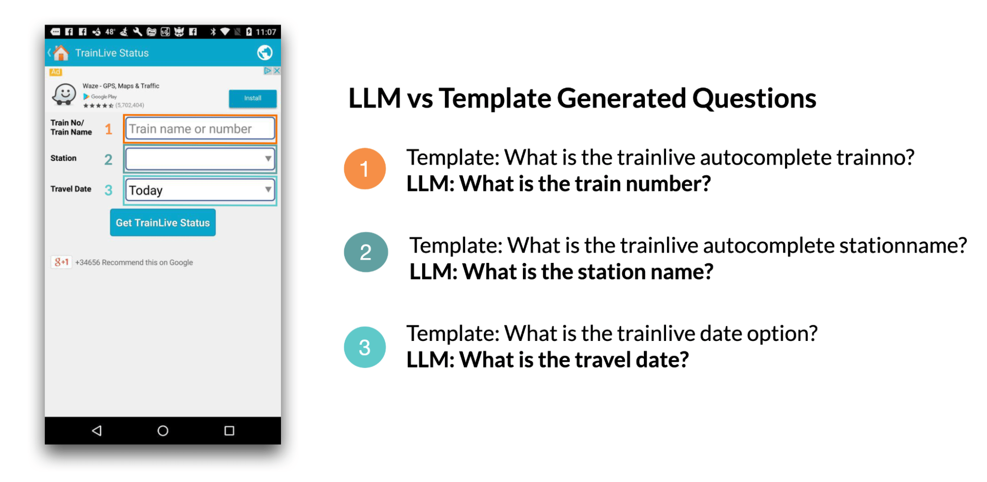 1. Generierung von Fragen für den Bildschirm: Wenn etwa eine mobile Benutzerschnittstelle (UI) dargestellt wird, kann das Sprachmodell relevante Fragen zu den UI-Elementen generieren, die eine Benutzereingabe erfordern. Laut Studie konnten Sprachmodelle Fragen mit nahezu perfekter Grammatik (4.98/5) generieren, die mit 92,8 Prozent eine hohe Relevanz für die auf dem Bildschirm angezeigten Eingabefelder hatten.