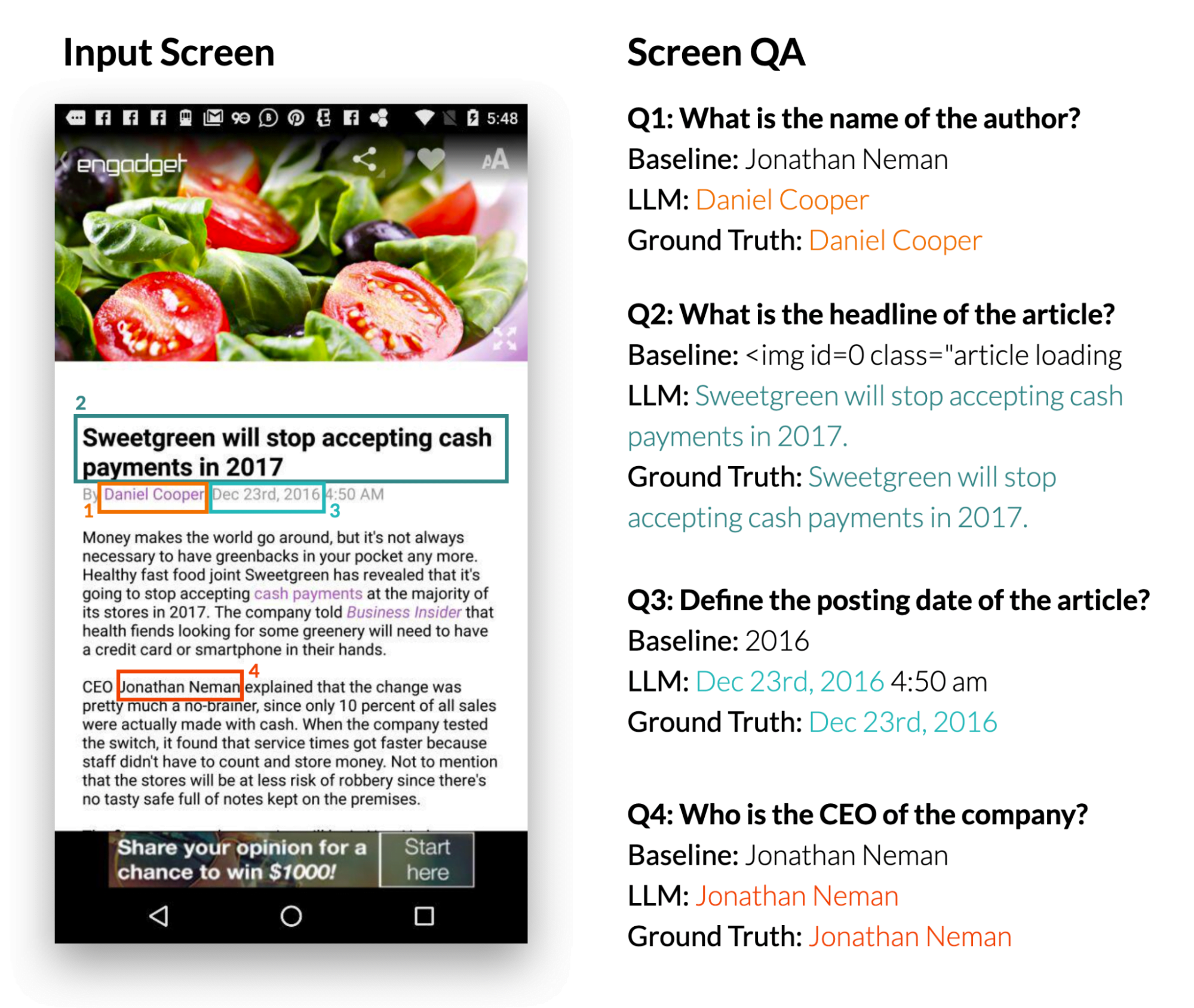 3. Beantwortung von Bildschirmfragen: Wenn ein mobiles UI und eine offene Frage präsentiert werden, die Informationen über die UI erfordert, kann das LLM die richtige Antwort liefern. Die Studie zeigt, dass LLMs Fragen wie "Was ist die Überschrift?" beantworten kann. Das LLM schnitt dabei deutlich besser ab als das Basis-QA-Modell DistilBERT.
