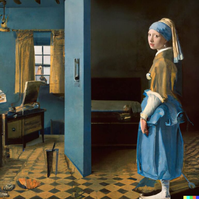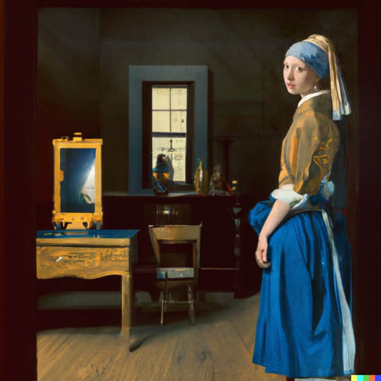 DALL-E 2 hingegen malt die junge Dame mit den hübschen Ohrringen in Zimmer mit verschiedenen Einrichtungen. Dabei ergänzt die KI den restlichen Körper ebenso wie das Zimmer samt Utensilien wie einem Schminkspiegel.