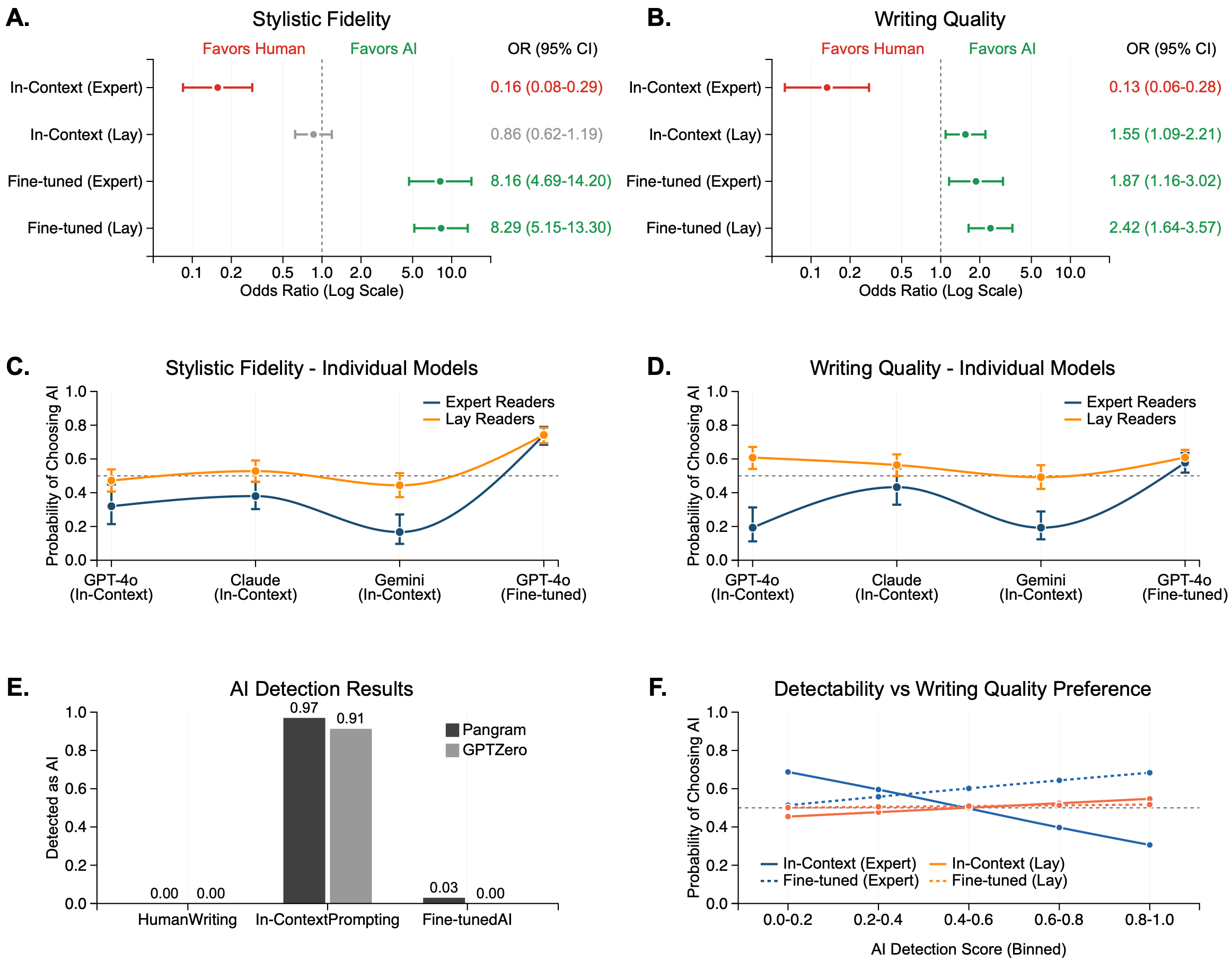Das Ergebnis hing entscheidend von der KI-Methode ab. Bei dem simpleren In-Context-Prompting bevorzugten insbesondere die professionellen Leser:innen klar die menschlichen Texte, während die Laien gemischte Ergebnisse zeigten.