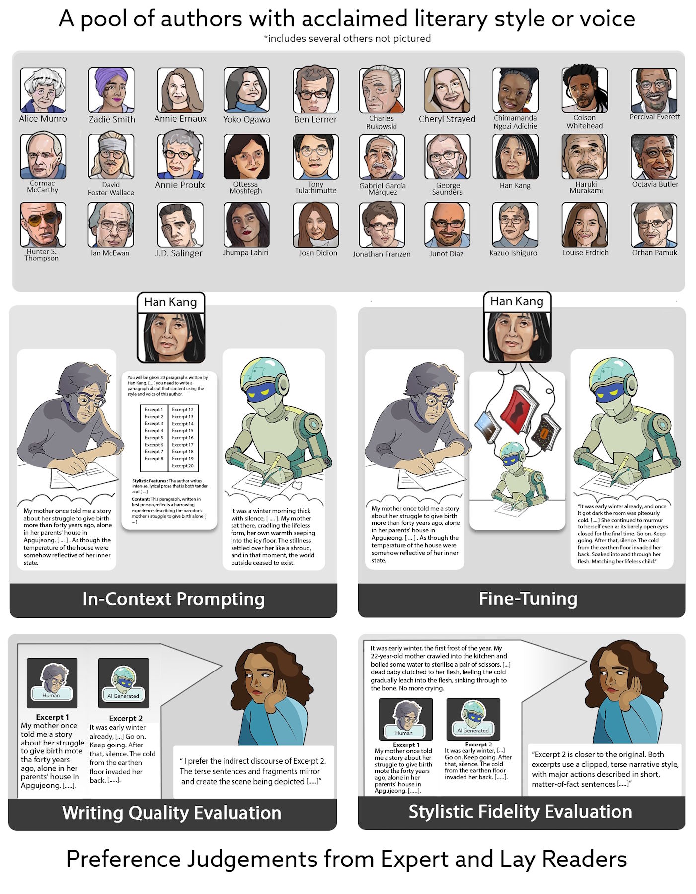 Wissenschaftler:innen der Stony Brook University und Columbia Law School ließen professionelle Schreiber:innen und drei KI-Systeme Texte im Stil von 50 berühmten Autor:innen verfassen, darunter Nobelpreisträger:innen wie Han Kang und Booker-Prize-Gewinner:innen wie Salman Rushdie. 159 Testpersonen bewerteten die Texte, ohne zu wissen, wer sie geschrieben hatte.